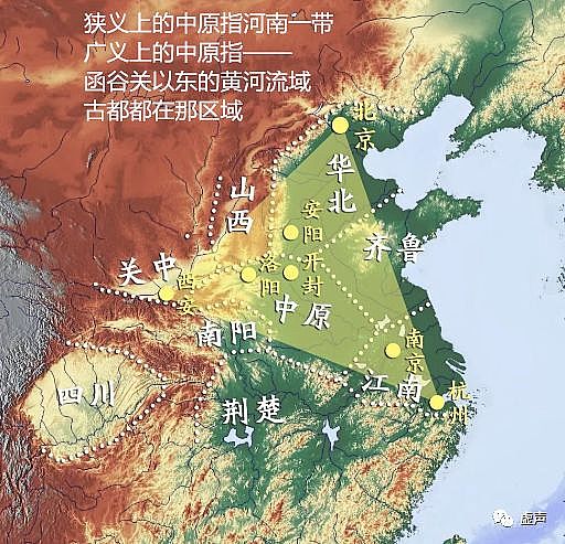 广义上的中原:函谷关以东的整个黄河流域,也就是华北平原。以杭州、北京、西安为三角形的区域里,包含了中国绝大部分古都。