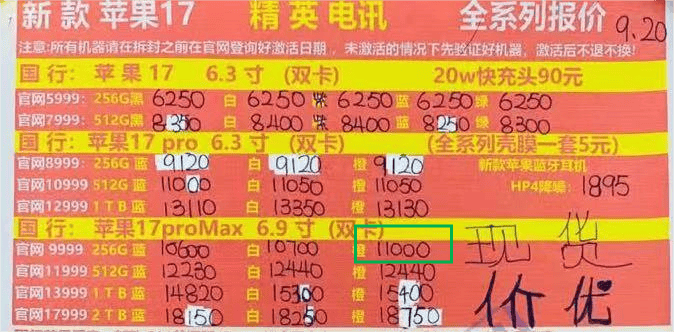 这时是9月20日下午4点左右,而翌日,记者再度前往同一档口,向小恋询价同色同型号的手机时,价格已涨至11350元。“发售第一天也差不多这个价,目前价格就是实时变动的,所以我们随时都会更新新的价目表。”小恋告诉记者。
