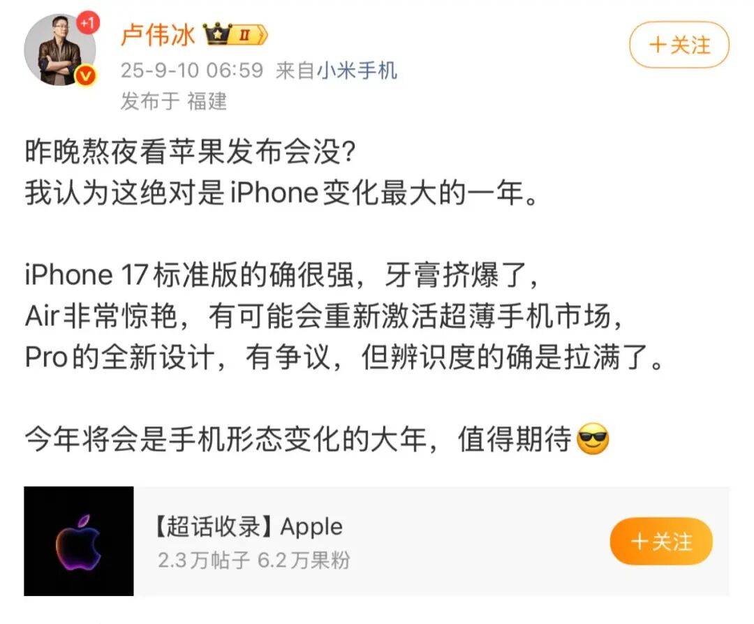 小米手机部总裁卢伟冰表示,“这绝对是iPhone变化最大的一年,iPhone17标准版牙膏挤爆,Air非常惊艳,Pro有争议但辨识度拉满。”小米甚至直接跳过16系列,发布小米17,表示“全面对标iPhone”。