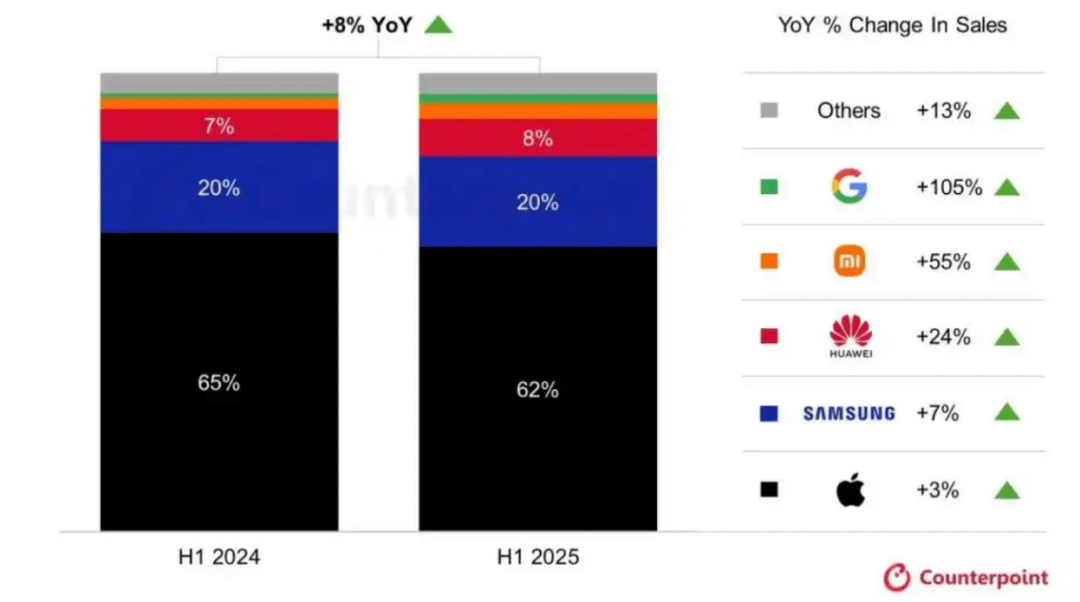 Counterpoint数据显示,2025年上半年,全球高端智能手机市场销量同比增长8%,创历史上半年最高纪录,增速高于同期仅同比增长4%的全球智能手机总市场。